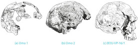 Cráneos de Homo sapiens. Los más incompletos datan de hace 190,000 años y el de la derecha de hace 157,000 años.